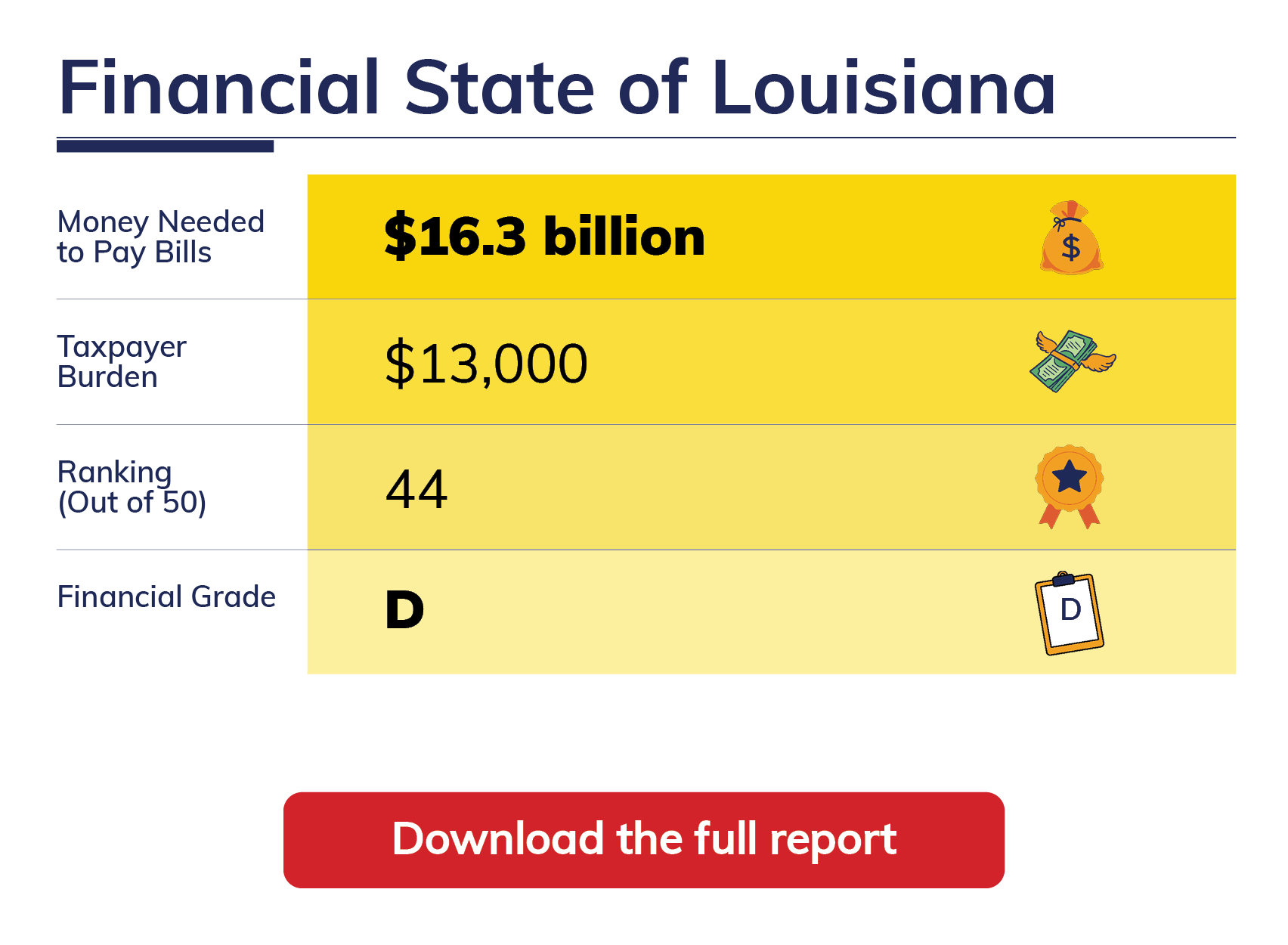 Because Louisiana doesn't have enough money to pay its bills, it has a -$16.3 billion financial hole. To fill it, each Louisiana taxpayer would have to send -$13,000 to the state. |