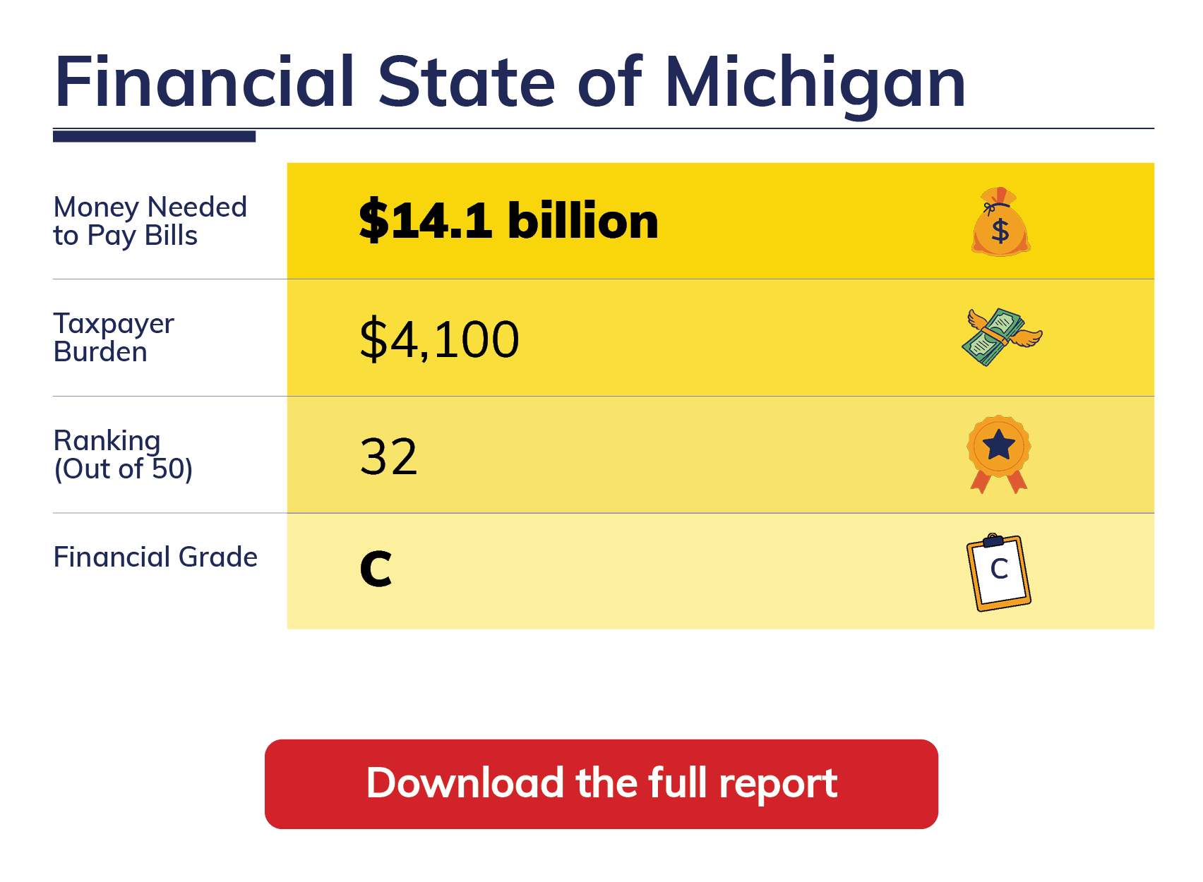 Because Michigan doesn't have enough money to pay its bills, it has a -$14.1 billion financial hole. To fill it, each Michigan taxpayer would have to send -$4,100 to the state. |
