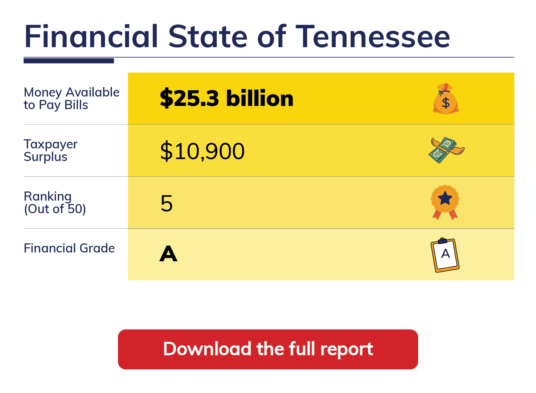 Tennessee has $25.3 billion available after bills have been paid, which breaks down to $10,900 per taxpayer. |